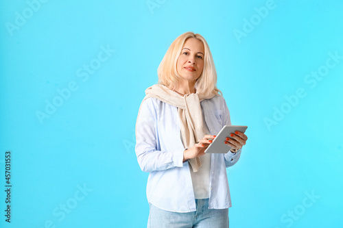 Fototapeta premium Portrait of mature woman with tablet computer on color background