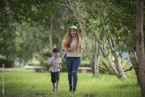 Obraz premium Portrait of mother and son happy walking together in the park holding hand....