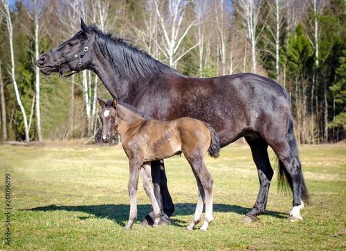 © vprotastchik, Fototapeta premium portrait of mother horse and child foal on spring landscape
