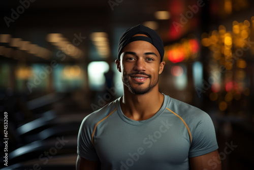 © zamuruev, Fototapeta premium portrait of muscular African American man resting in gym while looking at camera. Healthy lifestyle