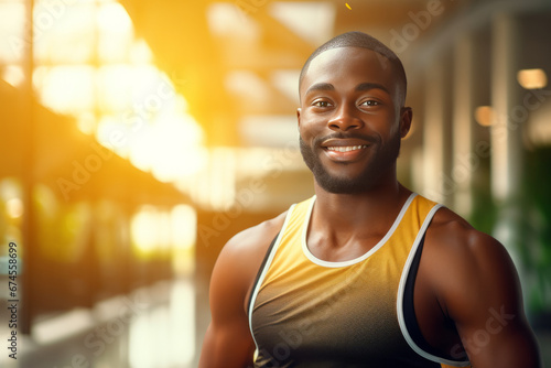 © zamuruev, Fototapeta premium portrait of muscular African American man resting in gym while looking at camera. Healthy lifestyle