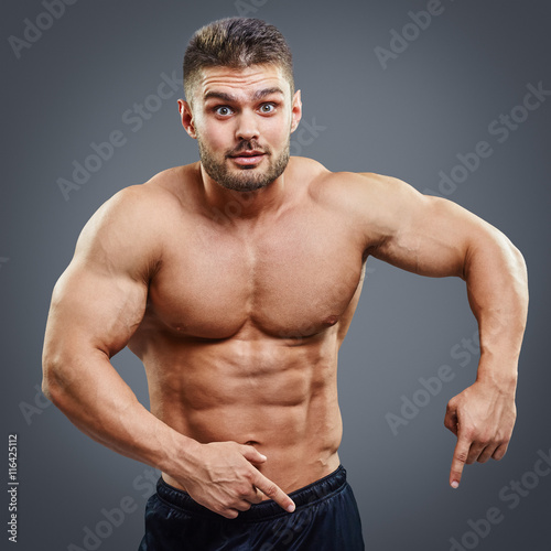 © kegfire, Fototapeta premium Portrait of muscular man who is pointing a fingers down