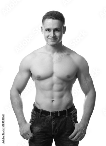 © Africa Studio, Fototapeta premium Portrait of muscular young bodybuilder on white background, toned effect