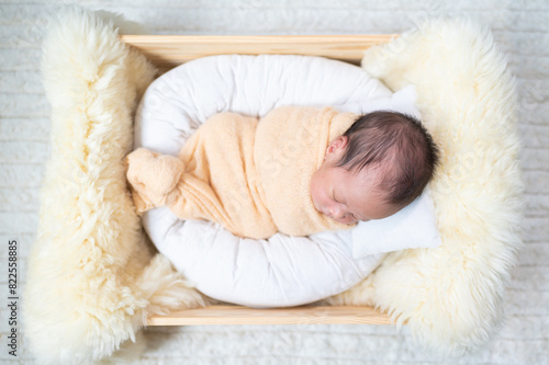 © structuresxx, Obraz premium Portrait of Newborn baby in costume sleeping in baby case
