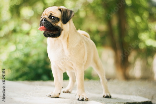 Obraz premium Portrait of newborn puppy pug. Cute little dog. Young pug outdoors. /pug in the park.