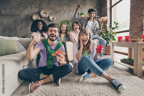© deagreez, Obraz premium Portrait of nice amazed cheerful friends sitting on carpet having fun eating snack watching cinema laughing in house loft brick style interior indoors