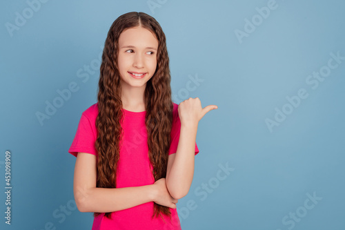 © Tetiana, Fototapeta premium Portrait of nice curious interested positive little girl direct thumb side look blank space on blue background