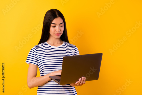 © deagreez, Naklejka premium Portrait of nice pretty vietnamese lady use wireless netbook coworking isolated on yellow color background