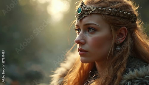 © Vadym, Obraz premium Portrait of Norse goddess Freyja with jewelry. Woman wears crown and earrings. Freyja stands in forest with fur coat. Fantasy character concept for mythical nordic culture and viking history era.