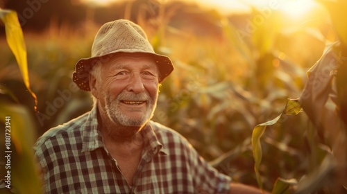 © Bargais, Obraz premium Portrait of old farmer wearing hat in corn field.