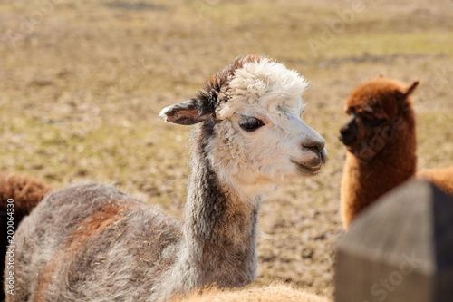 © Alvydas, Obraz premium Portrait of one white alpaca in a Lithuanian farm in the spring