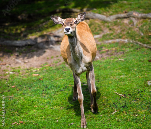 Fototapeta premium Portrait of powerful young red deer stag in forest