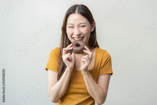 Fototapeta premium Portrait of pretty attractive asian young teenage woman holding chocolate, donut, doughnut, female emotion enjoy sweet. Dieting, diet for loss weight to slim. Isolated on white background, copy space