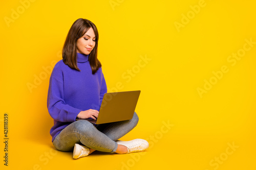 © deagreez, Naklejka premium Portrait of pretty focused girl sitting in lotus pose using laptop writing e-mail copy space isolated on bright yellow color background