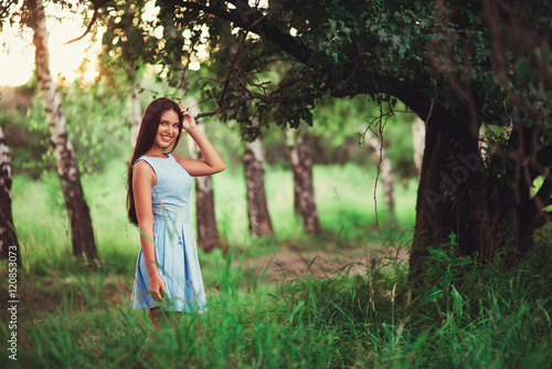 © nalliens, Naklejka premium Portrait of pretty girl near the tree in the park. Concept of youth and natural beauty. soft focus