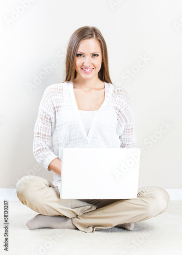 © koji6aca, Naklejka premium Portrait of pretty happy young woman lying on floor with a lapto