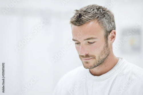 © Ruta, Fototapeta premium portrait of radio technician on right side of frame focused on single tool