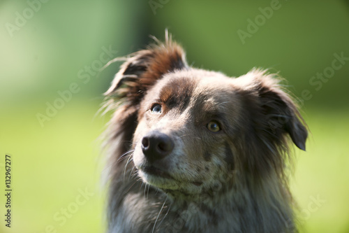 Fototapeta premium Portrait of red merle Australian shepherd. He is looking with cute expression.