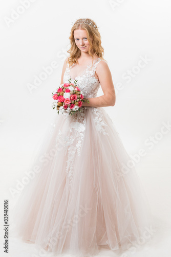 © Kaspars Suskevics, Fototapeta premium Portrait of romantic young bride in white lace wedding dress with fantasy makeup and wavy blonde hair with wedding bouquet in her hands getting ready in bride's morning. Fine art wedding.