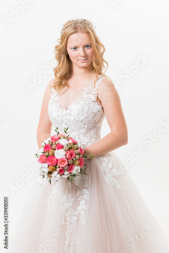 © Kaspars Suskevics, Fototapeta premium Portrait of romantic young bride in white lace wedding dress with fantasy makeup and wavy blonde hair with wedding bouquet in her hands getting ready in bride's morning. Fine art wedding.