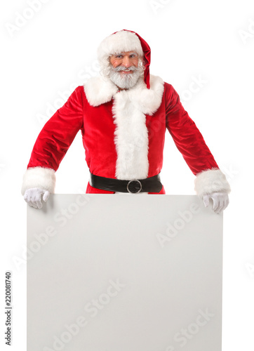 Naklejka premium Portrait of Santa Claus with blank poster on white background