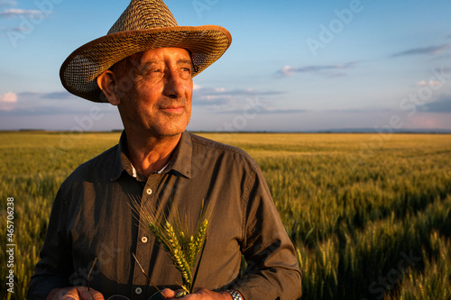© Zoran Zeremski, Fototapeta premium Portrait of senior farmer in standing in wheat at sunset.