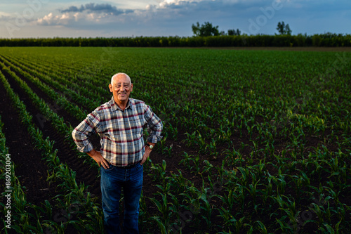 © Zoran Zeremski, Fototapeta premium Portrait of senior farmer standing in corn field looking at camera at sunset.