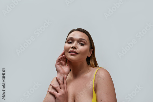 Obraz premium Portrait of sensual curvy young woman wearing yellow bra posing isolated over grey background