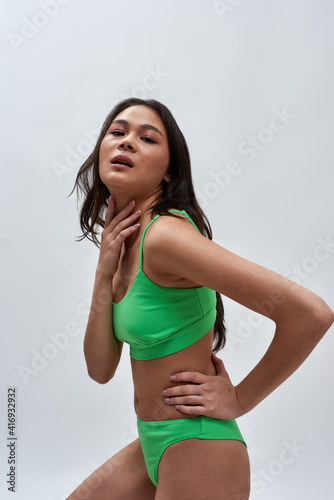 Fototapeta premium Portrait of sensual young female model with slim body wearing green underwear posing for camera isolated over light background