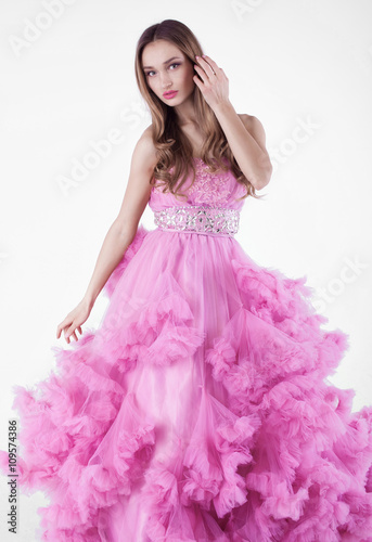 © lashkhidzetim, Fototapeta premium Portrait of sexy young beautiful caucasian blonde in gorgeous pink dress on white background