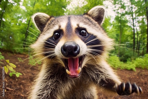 Fototapeta premium Portrait of shocked raccoon, fisheye effect