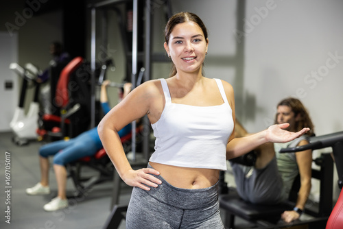 © JackF, Obraz premium Portrait of slim woman smiling after a work out in gym