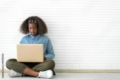 © Art_Photo, Fototapeta premium Portrait of smile black african american cute student little girl child sitting on floor using technology laptop computer typing on keyboard learn and study on white wall background