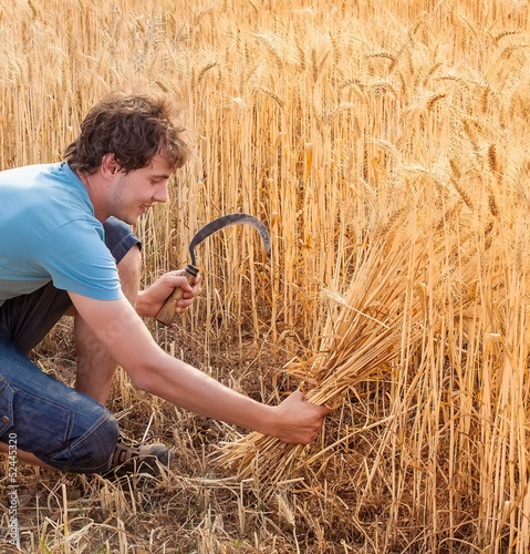 Obraz premium Portrait of smile harvest farmer with sickle