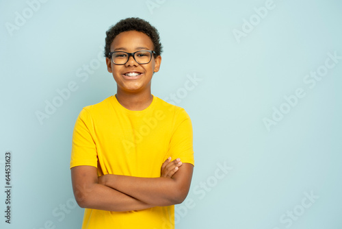 Obraz premium Portrait of smiling African American boy in yellow casual t shirt wearing glasses with crossed arms