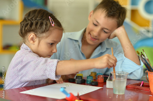 Fototapeta premium Portrait of smiling brother and sister drawing together