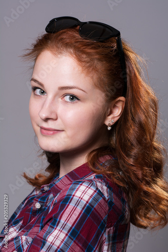 © kanzefar, Fototapeta premium Portrait of smiling girl with sunglasses on head looking at camera