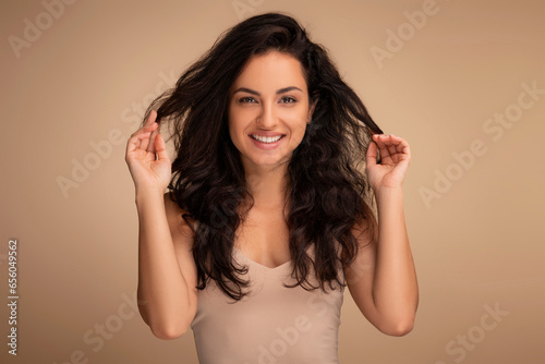 Fototapeta premium Portrait of smiling indian woman touching beautiful dark long hair