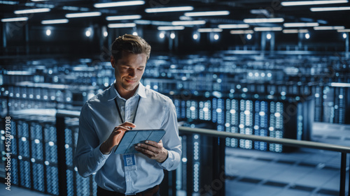 © Gorodenkoff, Naklejka premium Portrait of Smiling IT Specialist Using Tablet Computer in Data Center. Big Server Farm Cloud Computing Facility with Male Maintenance Administrator Working. Cyber Security, e-Business.
