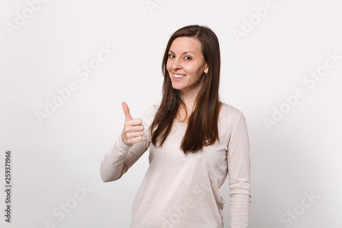 Fototapeta premium Portrait of smiling pretty young woman in light clothes looking camera, showing thumb up isolated on white wall background in studio. People sincere emotions, lifestyle concept. Mock up copy space.