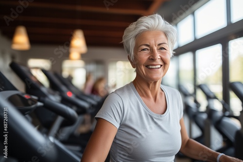© Kristina, Fototapeta premium Portrait of smiling senior woman on exercise bike in fitness center with people on background