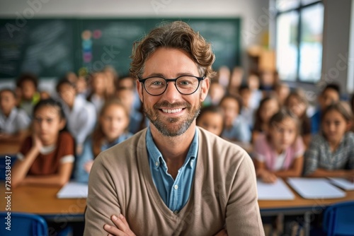 Fototapeta premium Portrait of smiling teacher in a class at elementary school looking at camera with learning students on background, Generative AI