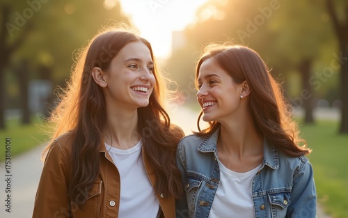 © wang, Obraz premium Portrait Of Smiling Young Friends Walking Outdoors Together. High quality