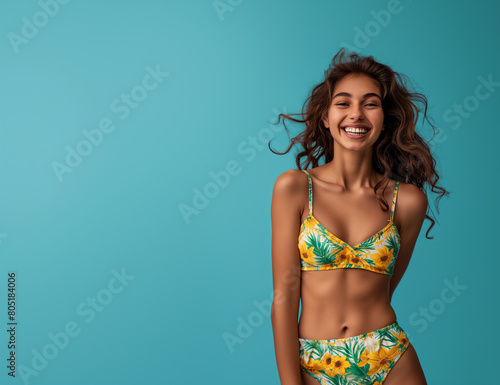© dewaai, Naklejka premium Portrait of smiling young woman in swimsuit isolated on blue background, summer-themed designs, copy space
