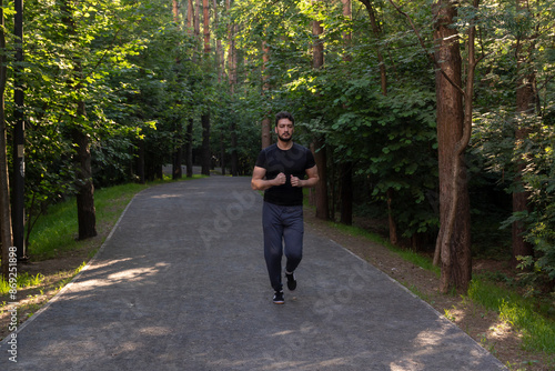 © Vitaliy, Fototapeta premium Portrait of sporty and handsome man in black sportswear walking in the eco park. Healthy lifestyle and running in open air concept
