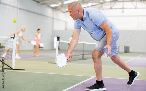 Fototapeta premium Portrait of sporty senior man playing pickleball on indoor court, ready to...