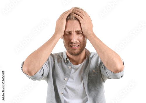 © Pixel-Shot, Naklejka premium Portrait of stressed man on white background