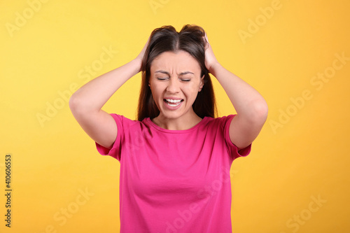 Fototapeta premium Portrait of stressed young woman on yellow background
