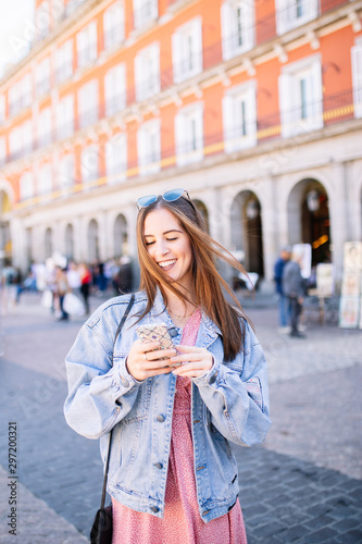 © EGHStock, Fototapeta premium Portrait of stylish smiling happy young woman in the street with perfect white teeth looking her mobile. Summer fashion trend, denim jacket, sunglasses, cheerful, positive, laughing. Phone concept.