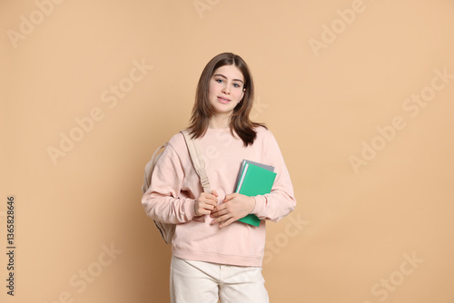 Fototapeta premium Portrait of teenage girl with books and backpack on beige background